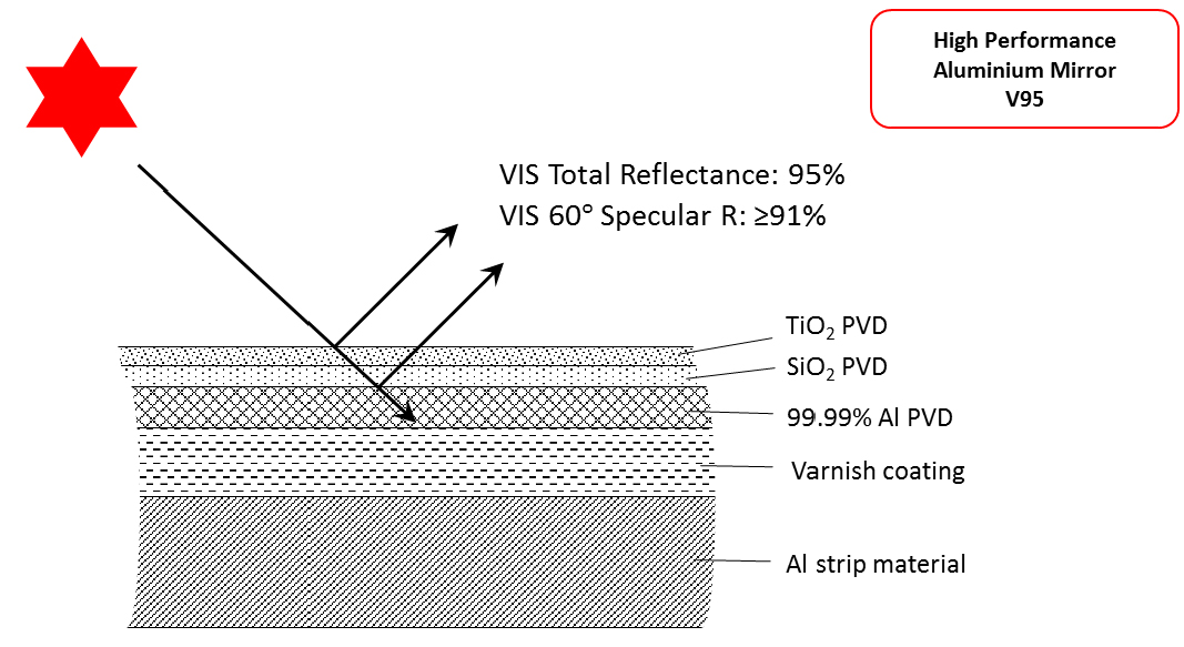 ---High performance AI mirror product V95 is specially designed to attain high specular reflectance and Indoor Louver-type Light Collecting System application.